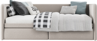 У моделі ліжка для дитячої вдало поєднуються функціональність, затишок, безпека і привабливий дизайн. Ліжко з боковинами і спинкою, що зливаються в єдину конструкцію. Для безпеки корпус пом'якшений наповнювачем і покритий зносостійкою меблевою тканиною, саме тому гострі кути і тверді елементи відсутні. Декорується спинка і боковини кантом в тон оббивки або в контрастною кольоровій гамі. Рекомендується ліжко дівчаткам і хлопчикам старше 3-х років.