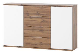 Комод 2-дверний з 4-ма ящиками в сучасному виконанні. Головну роль у цій колекції відіграють кольори: дуб вотан у поєднанні з білим – цікавий дует, який неодмінно приверне увагу найвибагливіших. Функціональний комод з глибокими ящиками, в якому ми розташовуємо прикраси, білизну та аксесуари. Місце на комоді ідеально підходить для демонстрації аксесуарів, які доповнюють композицію.