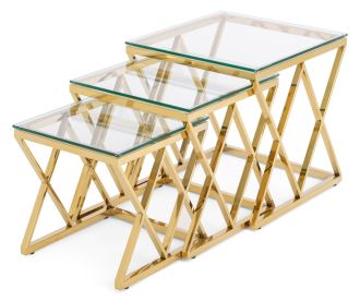 Три лаконічних та акуратних столика різних розмірів мають стільницю, виготовлену з прозорого загартованого скла. Практичне поєднання скла та металу виглядає стильно та оригинально, додає сяяння кімнаті та стає вишуканим акцентом інтер'єру.